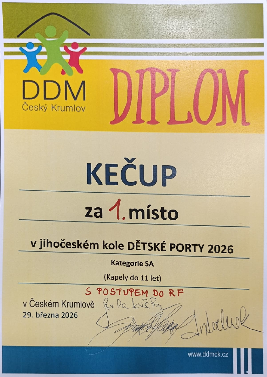 Kubatovka má kapelu! Děti ze 4.A si založily kapelu KEČUP. V neděli 29.3. se kapela zúčastnila Dětské porty v Českém Krumlově, kde děti zahrály 3 písně a moc se jim to povedlo. Obsadily první místo a postoupily do celorepublikového finále do Kroměříže. Držte nám palce, jedeme v sobotu 30.5. bojovat za Kubatovku.
